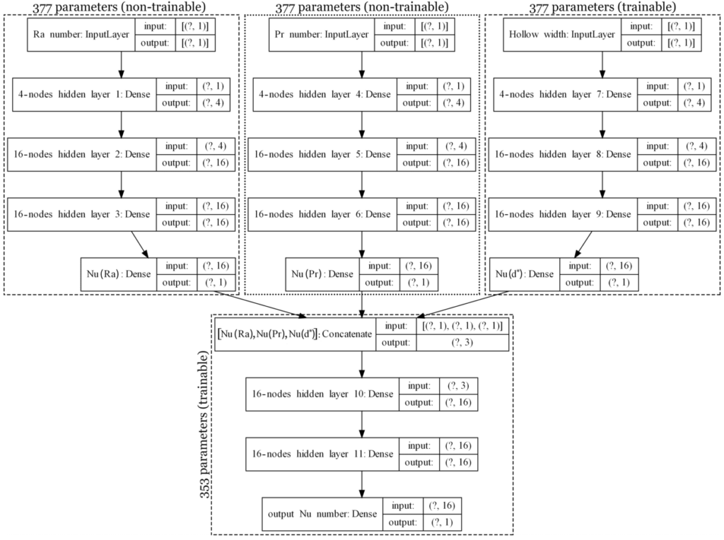 Fig. 2. The structure of the DNN for metamodeling Nu in hollow enclosures. Out of 1484 total parameters, 730 were trainable whereas the rest received their weights from the metamodel for the benchmark problem.