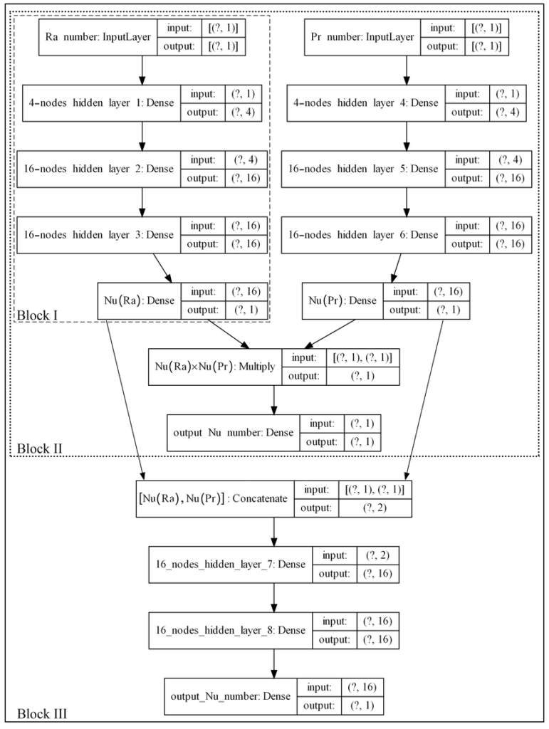 Fig. 1. The structure of the DNN for transfer learning. Block I consists of a metamodel that predicts the variation of Nu with Ra (where Pr is unchanged). In Block II, there is a second branch that takes Pr into account as a new input. The outputs of the two branches are Multiplied to produce the output of Block II. In Block III, the outputs are concatenated and two hidden layers are added to the model in order to improve the training.