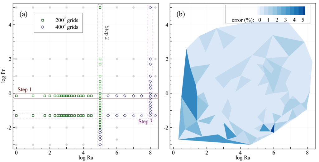 To enhance accuracy, one can remove the Multiply layer from block II and replace it with a concatenated layer followed by two additional hidden layers (Block III in Fig. 1). We froze the training on the two branches in Fig. 1 and applied the weight values from step 2 (Block II). We trained the added hidden layers in Block III using new simulation points at fixed Ra=108 or at fixed Pr=0.05 on top of the previous dataset. As presented in Table 2 (Step 3), our results on the test dataset improved remarkably after applying this procedure. The scatter graph for the different training datasets that we employed in this approach is presented in Fig. 2a. The test error contour for this approach is shown in Fig. 2b (for Step 3). Further improvements in model accuracy can be achieved after retraining the DNN from step 3 using more data. For example, using 31 additional data points (shown by grey symbols in Fig. 2a) decreased the test loss by 51% (RE = 0.45±0.66) at an increased simulation cost of 28%.
